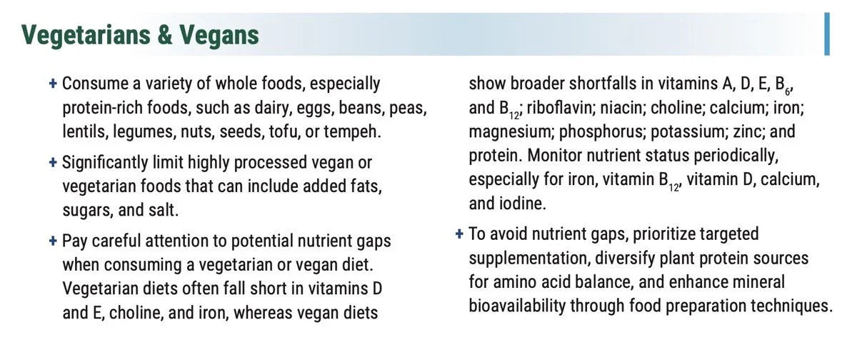 The new protein-centric guidelines eliminated the "vegetarian dietary pattern" from the 2015 and 2020 guidelines. The new, 9-page guidelines go even further with a full half-page section warning about the lack of essential nutrients in vegetarian and vegan diets. Some of this information had been present but buried in the 100+-page previous editions of the guidelines. It's good to see this critically important information for people following these diets.